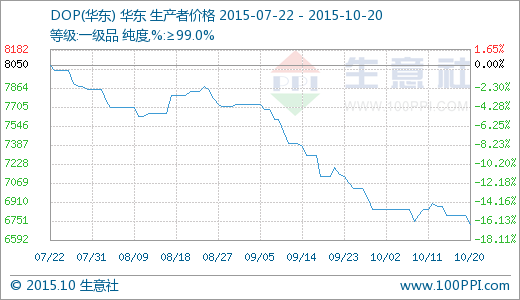 中國醫(yī)藥化工網(wǎng)10月20日 華東地區(qū)DOP出廠報(bào)價(jià)持續(xù)下跌,報(bào)價(jià)主要執(zhí)行6600-6800元/噸。當(dāng)前上游辛醇價(jià)格穩(wěn)定,目前現(xiàn)貨價(jià)格在5600元/噸左右徘徊,苯酐價(jià)格亦小幅下跌。昨日隔夜國際油價(jià)大跌,令國內(nèi)市場擔(dān)憂情緒加重;成本面支撐不足,利好引導(dǎo)有限也導(dǎo)致DOP上漲支撐無力,今日市場氣氛明顯冷清,中間貿(mào)易商出貨一般。預(yù)計(jì)后期窄幅震蕩,延續(xù)震蕩走勢。
