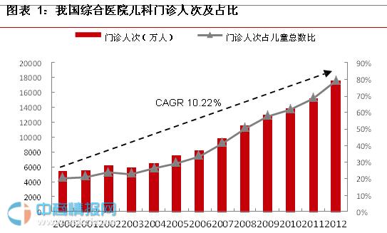 兒科門診人次及占比逐年提高,體現(xiàn)了旺盛的醫(yī)療需求。從2000年至2012年,我國綜合醫(yī)院兒科門診人次翻了3倍多,達(dá)到1.76億人次,CAGR為10.22%,門診人次占兒童總數(shù)的比重從20.47%上升為79.00%。