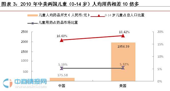 橫向比較,中國兒童人均藥品消費(fèi)金額不到美國的1/10,蘊(yùn)含巨大潛力。2010年美國藥品市場(chǎng)規(guī)模3100億美元,其中兒童(0-14歲)藥165億美元,占5.32%。2010年我國藥品市場(chǎng)規(guī)模7556億元,其中兒童藥392億元,占5.19%。2010年,中國和美國兒童人均用藥金額分別為176元和1956元,十倍多的差距顯示中國兒童用藥市場(chǎng)巨大的潛力。