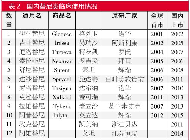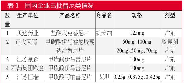 替尼類抗腫瘤藥物是一類新型生物靶向治療腫瘤藥物,目前在我國市場上常見的替尼類產(chǎn)品有伊馬替尼、吉非替尼、厄洛替尼、索拉非尼、??颂婺帷⑹婺崽婺?、克唑替尼、尼洛替尼、達沙替尼、拉帕替尼、阿帕替尼11只產(chǎn)品,2015年4月,輝瑞公司的阿昔替尼片在我國獲得進口批件,使國內(nèi)上市的替尼類品種增至12只。