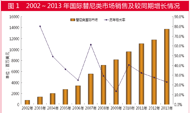 據(jù)全球暢銷藥數(shù)據(jù),全球替尼類用藥市場規(guī)模從7.53億美元增長到2013年的137.2億美元,較同比增長23.1%。替尼類藥物自上市以來,一直保持較高的增長速度,2002~2013年,其復合增長率為30.2%,11年整體市場增長18.2倍,遠遠高于全球整體市場增長速度。