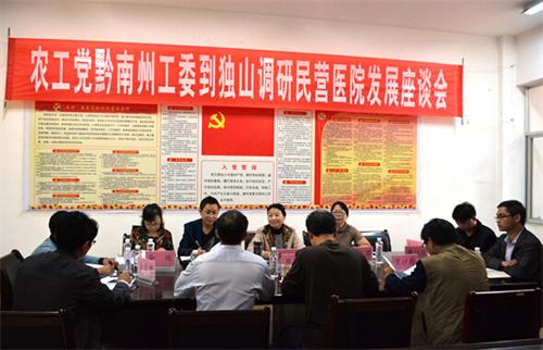 農(nóng)工黨即中國農(nóng)工民主黨,是以醫(yī)藥衛(wèi)生、人口資源和生態(tài)環(huán)境領(lǐng)域高中級知識分子為主,具有政治聯(lián)盟特點,致力于建設(shè)中國特色社會主義事業(yè)的政黨,是同中國共產(chǎn)黨通力合作的參政黨。此次調(diào)研是履行憲法規(guī)定的民主黨派參政議政權(quán)利,也體現(xiàn)中國共產(chǎn)黨與各民主黨派合作的基本方針。座談中,獨山縣匯報了目前獨山民營醫(yī)院發(fā)展現(xiàn)狀及存在問題和對策建議等。民營醫(yī)院作為公立醫(yī)院的補充,對滿足不同人群的醫(yī)療服務(wù)需求、完善城市醫(yī)療衛(wèi)生服務(wù)體系、緩解人民群眾“看病難、看病貴”發(fā)揮著重要作用,已成為獨山縣衛(wèi)生事業(yè)發(fā)展的重要組成部分。經(jīng)過近十年的發(fā)展,獨山共有民營醫(yī)院5家,其中綜合醫(yī)院4所、精神病??漆t(yī)院1所,共開放床位250張,占全縣開放床位比26.1%,衛(wèi)生技術(shù)人員184人,占全縣衛(wèi)生技術(shù)人員比17.1%。2014年,獨山縣民營醫(yī)院診療達5.8萬人次,醫(yī)療總收入約1600萬元,在保障人民群眾身體健康上發(fā)揮重要作用。
