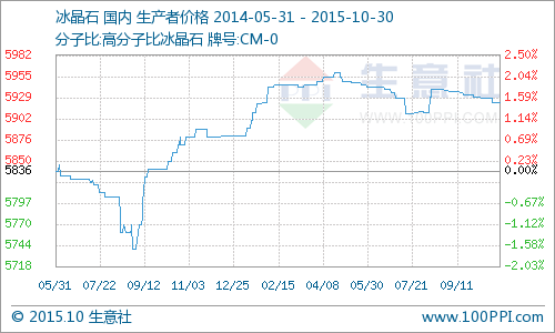 據(jù)生意社大宗榜數(shù)據(jù)顯示本月初國(guó)內(nèi)市場(chǎng)均價(jià)為5930元/噸,月末為5923元/噸,價(jià)格小幅下跌0.12%,同比上漲0.73%。10月29日冰晶石商品指數(shù)為71.94,與昨日持平,較周期內(nèi)最高點(diǎn)101.21點(diǎn)(2011-10-31)下降了28.92%,較2013年09月30日最低點(diǎn)69.47點(diǎn)上漲了3.56%。(注:周期指2011-09-01至今)