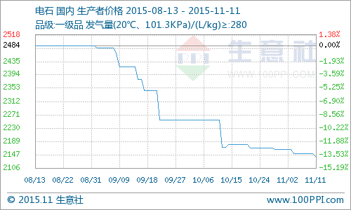 11月11日電石商品指數(shù)為56.10,較昨日下降了0.26點(diǎn),創(chuàng)下周期內(nèi)的歷史新低,較2011年09月26日最高點(diǎn)101.31點(diǎn)下降了44.63%。