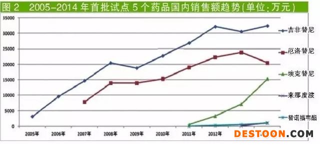 據國內樣本醫(yī)院數據統(tǒng)計,國內替尼類用藥市場規(guī)模從2005年的5339萬元增長到2014年的14.9億元,2014年同比增長38.2%。國內替尼類藥物自上市以來一直保持較高的增長速度,2005-2014年復合增長率高達44.7%,9年整體市場增長27.8倍。