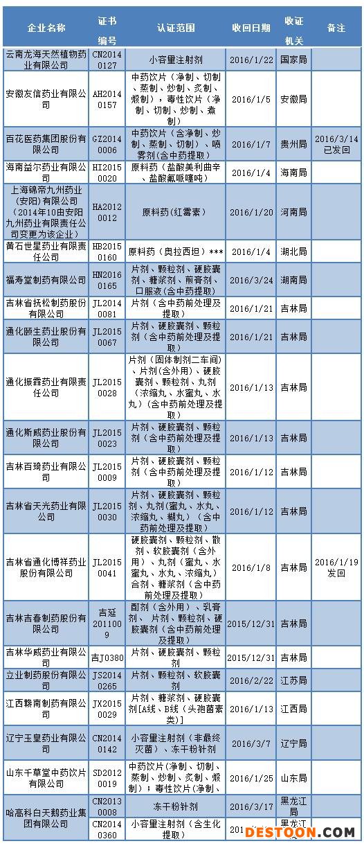 附:2016年目前全國(guó)被收回GMP證書(shū)情況