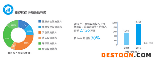 在EHS方面,重視環(huán)保,持續(xù)升級(jí)改造,2015年環(huán)保設(shè)施投入2156萬(wàn)元,較2014 年增加70%;更有效利用水資源,總循環(huán)用水量為2014年的6.38 倍;職業(yè)健康安全硬件投入與運(yùn)營(yíng)總費(fèi)用4505萬(wàn)元,是2014年的2倍,同時(shí)EHS培訓(xùn)總時(shí)長(zhǎng)超過7萬(wàn)小時(shí)。
