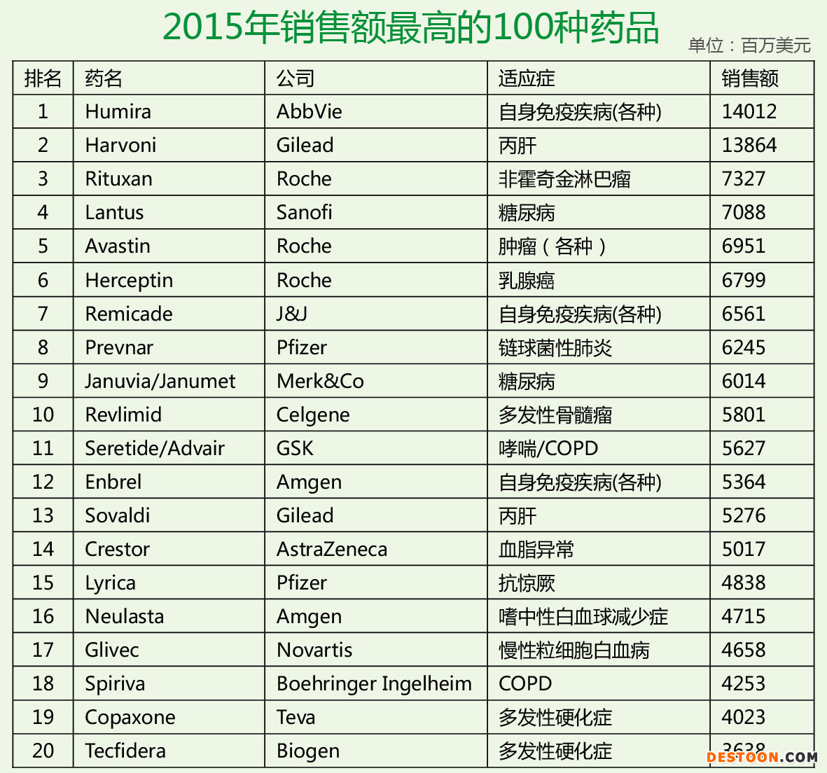 中國醫(yī)藥化工網(wǎng)4月21日訊 FirstWord發(fā)布2015年銷售額最高的100種藥品清單,加起來超過2650億美元。前十個就達800億美元。而前兩個產(chǎn)品單藥Harvoni和Humira銷售超過100億美元。
