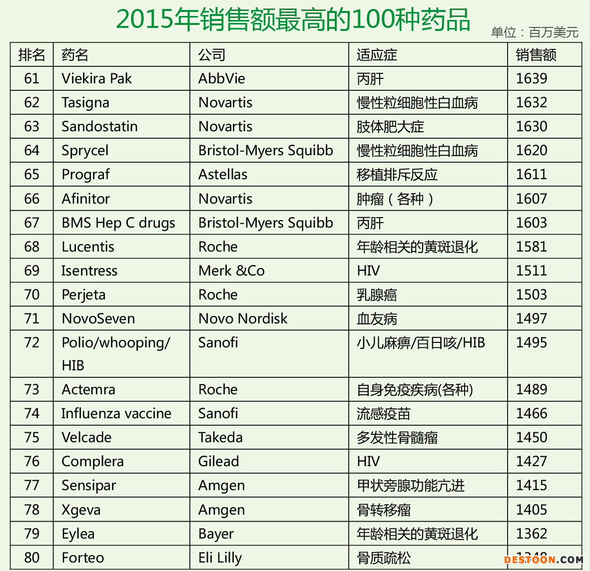 在過去的幾年內(nèi)推出其他 100 強藥物包括 Tecfidera(Biogen,多發(fā)性硬化癥),Xarelto(Bayer/J&J,抗凝劑),Eliquis(Bristol-Myers Squibb,抗凝劑),Stribild(Gilead,HIV)、Eylea(Regeneron/Bayer,AMD)、Invokana(J & J,糖尿?。┖蚗tandi (Astellas/Medivation,前列腺癌)也在表單。