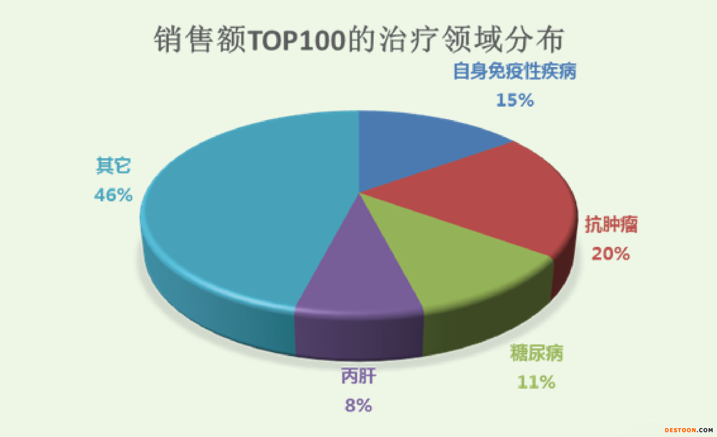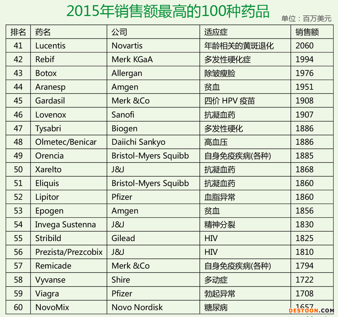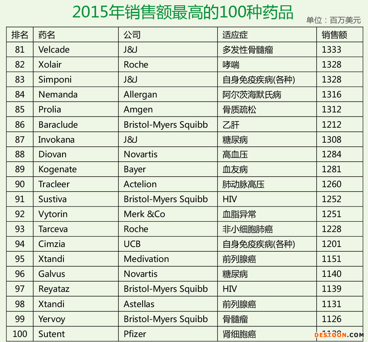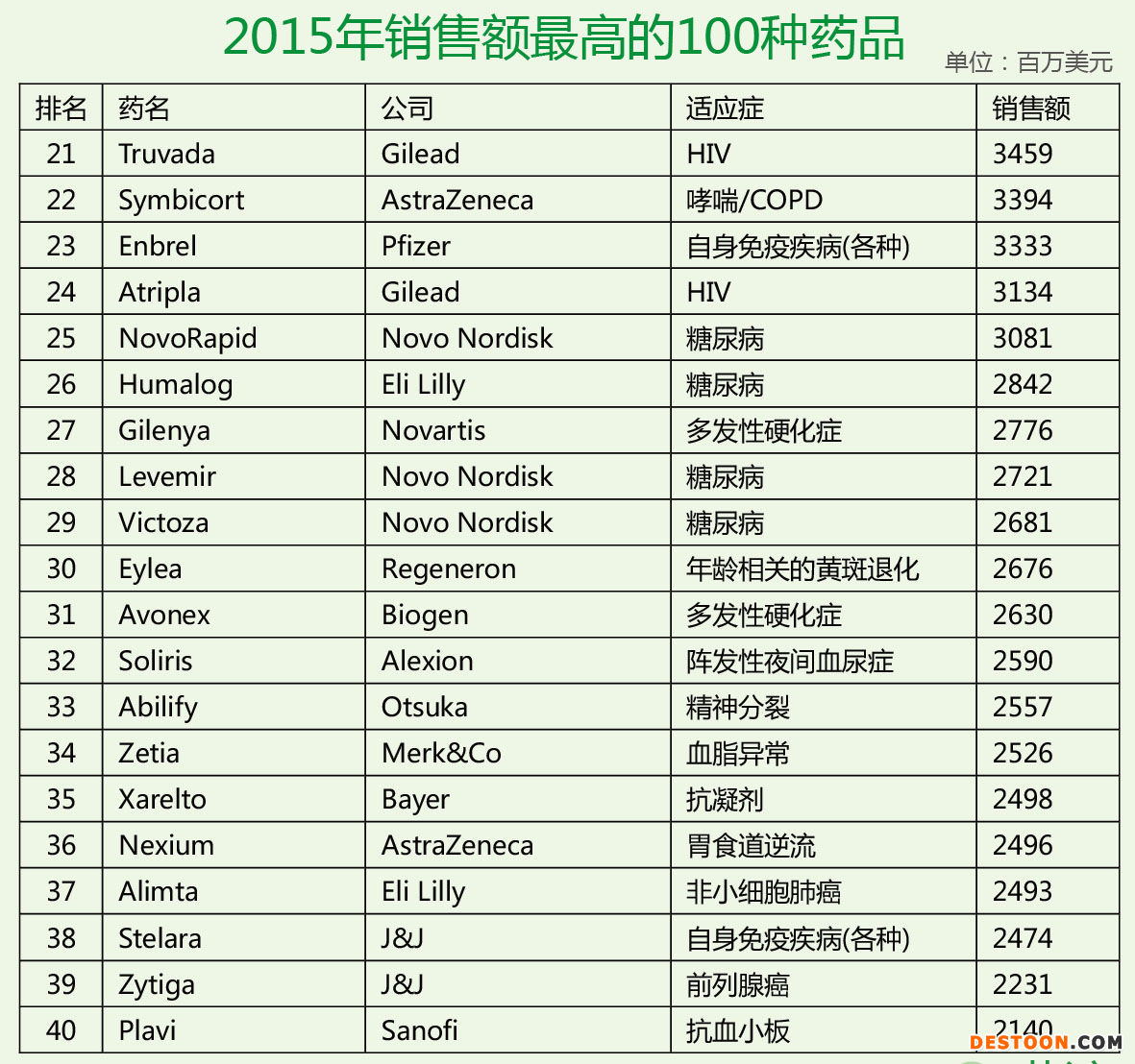 有些藥品的專營權(quán)是由兩個或更多的公司持有,他們共同銷售,最后成就了目前100名銷售排名。例如 ︰Enbrel(Amgen/Pfizer)銷售87億美元, Eylea(Regeneron/Bayer)銷售40億美元, Lucentis(Roche/Novartis)銷售36億美元以及Remicade(Johnson&Johnson/Merck & Co.)銷售83億美元。