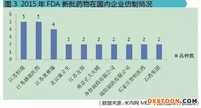 經(jīng)過(guò)對(duì)這9個(gè)新藥的相關(guān)審評(píng)信息分析,可以看出國(guó)內(nèi)企業(yè)的研發(fā)實(shí)力。江蘇恒瑞醫(yī)藥股份有限公司、江蘇盛迪醫(yī)藥有限公司、江蘇奧賽康藥業(yè)股份有限公司3家公司的仿制品種數(shù)排在前列,分別是5個(gè)、5個(gè)和4個(gè)。此外,北京康立生、江蘇萬(wàn)邦、南京正大天晴、齊魯制藥、瑞陽(yáng)制藥、石家莊智恒醫(yī)藥、石藥集團(tuán)均有2個(gè)仿制品種,其余30家國(guó)內(nèi)企業(yè)均各有1個(gè)仿制品種(不納入圖表中分析)。雖然這只是特指對(duì)2015年FDA新批藥物的仿制,只是比較小的一個(gè)層面,但也能間接看出排在前三公司的研發(fā)實(shí)力。