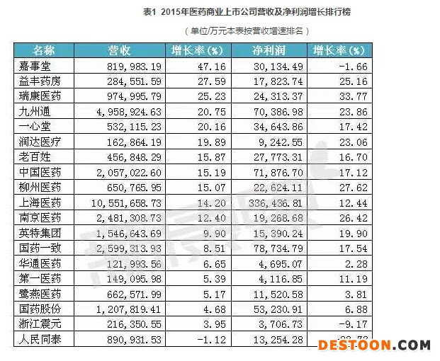 表1 2015年醫(yī)藥商業(yè)上市公司營收及凈利潤增長排行榜