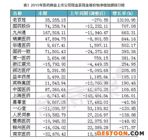 表3 2015年醫(yī)藥商業(yè)上市公司現(xiàn)金及現(xiàn)金等價物凈增加額排行榜