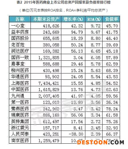 表2 2015年醫(yī)藥商業(yè)上市公司總資產(chǎn)回報率及負債率排行榜