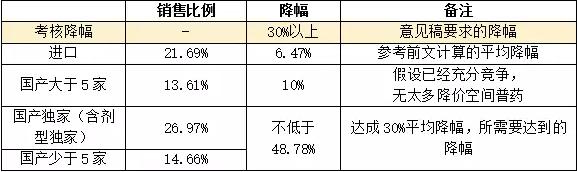 接下來(lái),我們做一個(gè)簡(jiǎn)單的數(shù)學(xué)題,假若進(jìn)口藥品平均降幅僅6.49%,一些常見(jiàn)普藥降幅不足10%,經(jīng)過(guò)測(cè)算,國(guó)產(chǎn)獨(dú)家藥品,國(guó)產(chǎn)較少?gòu)S家產(chǎn)品需要承擔(dān)不低于48.78%的降幅,才能達(dá)成試點(diǎn)城市對(duì)GPO組織的考核要求。