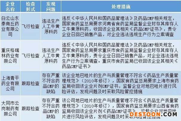 根據(jù)對重慶格瑞林藥業(yè)有限公司和白云山東泰商丘藥業(yè)有限公司的飛行檢查通報,此兩家藥企均存在人工牛黃原料藥生產(chǎn)的嚴(yán)重違法行為,被收回相關(guān)《藥品GMP證書》,責(zé)令企召回已銷售產(chǎn)品,同時被立案調(diào)查。