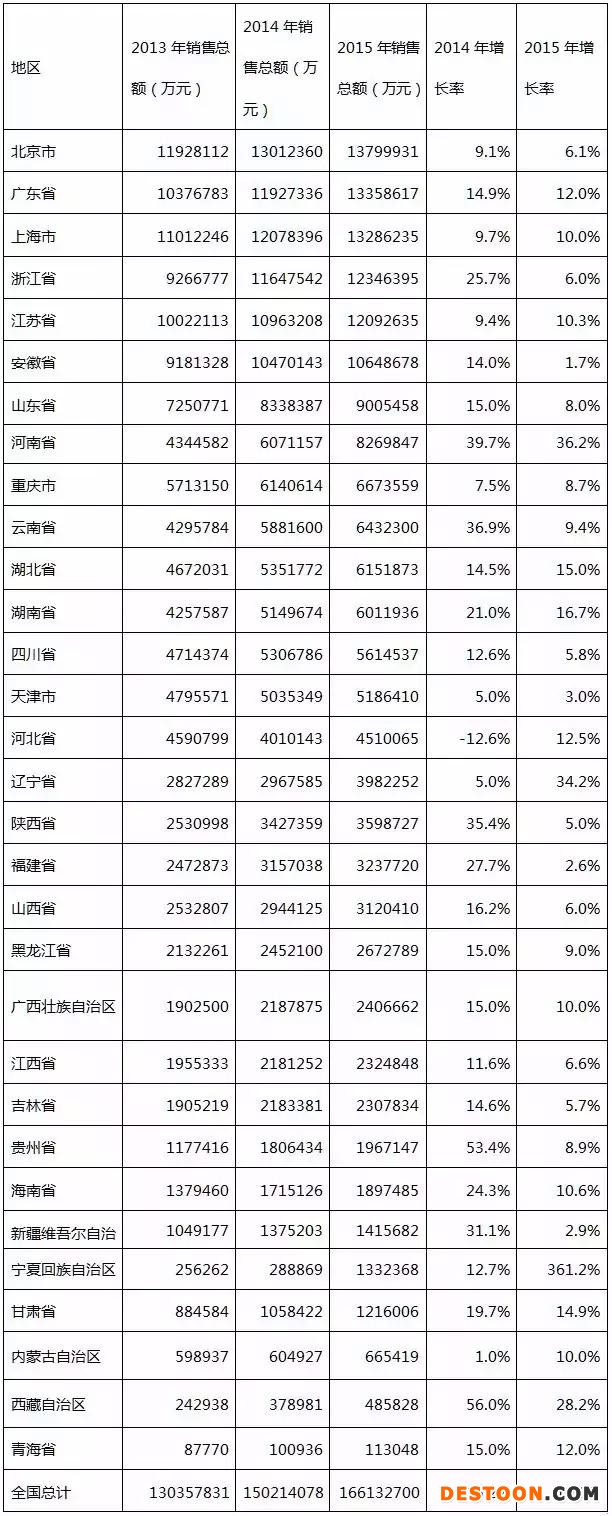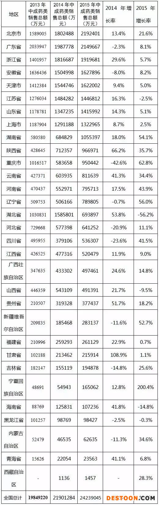 表3 2013年至2015年各省中成藥類銷售總額