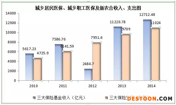 數(shù)據(jù)顯示,2010年,職工醫(yī)保、居民醫(yī)保、新農(nóng)合的基金收入分別為3955億元、354億元和1309億元;支出分別為3272億元、267億元和1188億元。到2014年,三大保險制度的基金收入分別達(dá)到8038億元、1649億元和3025.3億元,合計收入12712億元,比2010年(5617億元)增長了126.3%,年均增幅22.6 %。