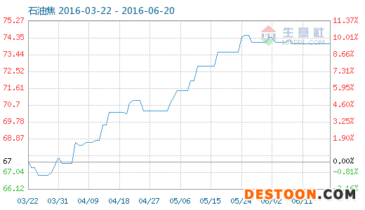 6月19日石油焦商品指數(shù)為74.04,與昨日持平,較周期內(nèi)最高點108.79點(2013-04-15)下降了31.94%,較2016年03月28日最低點66.89點上漲了10.69%。(注:周期指2012-09-30至今)