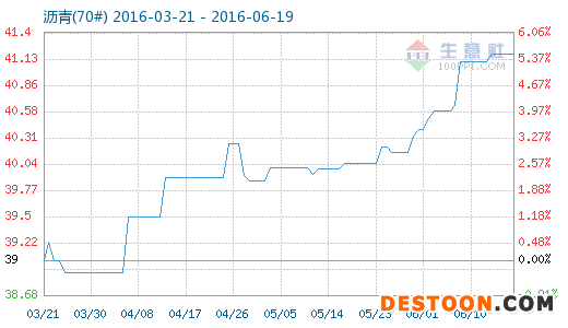 6月19日瀝青(70#)商品指數(shù)為41.18,與昨日持平,較周期內(nèi)最高點(diǎn)100.19點(diǎn)(2013-10-10)下降了58.90%,較2016年03月15日最低點(diǎn)38.88點(diǎn)上漲了5.92%。(注:周期指2013-09-30至今)