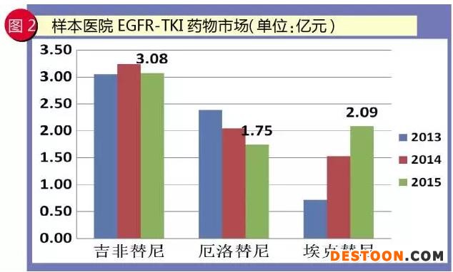 作為第一個在中國獲批的EGFR-TKI,易瑞沙通過在中國的多年推廣,已經(jīng)獲得了巨大的市場規(guī)模。根據(jù)PDB樣本醫(yī)院數(shù)據(jù)庫,2015年易瑞沙樣本醫(yī)院銷售額為3.08億元,位居該類藥物銷售額首位。但隨著??颂婺嵘鲜?,易瑞沙受到了一定的影響,2015年銷量有所萎縮。