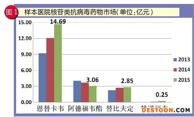 不過,從銷量上看,由于韋瑞德的乙肝適應(yīng)癥獲批較晚,加之價格較貴,因此臨床上替諾福韋的市場份額遠(yuǎn)低于恩替卡韋等競品。2015年韋瑞德樣本醫(yī)院銷售額僅為2500萬元,同期恩替卡韋樣本醫(yī)院銷售額超過14億元。由于上市較晚,替諾福韋在核苷類抗肝炎病毒用藥市場的規(guī)模還非常有限,主要競品包括恩替卡韋、阿德福韋酯和替比夫定市場開拓多年,進(jìn)入了醫(yī)保且價格更低,這都阻礙了替諾福韋市場的增長,替諾福韋急需解決增長乏力的問題。