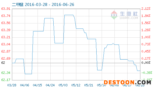 6月27日二甲醚商品指數為62.40,與昨日持平,較周期內最高點115.59點(2013-12-15)下降了46.02%,較2016年02月26日最低點60.78點上漲了2.67%。(注:周期指2011-09-01至今)