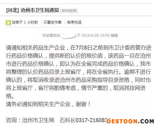 6月28日,一份河北滄州市衛(wèi)生局確認調(diào)價的文件,在醫(yī)藥行業(yè)論壇和微信群引起了騷動。筆者查詢滄州衛(wèi)生局并未公開此文件,但有知情人士表示,有人給滄州衛(wèi)生局打過電話,說真有此事。通知內(nèi)容如下: