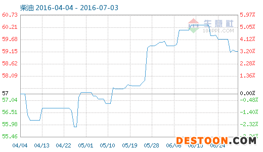 7月3日柴油商品指數(shù)為59.16,與昨日持平,較周期內(nèi)最高點(diǎn)109.93點(diǎn)(2012-03-30)下降了46.18%,較2016年04月27日最低點(diǎn)55.90點(diǎn)上漲了5.83%。(注:周期指2011-09-01至今)