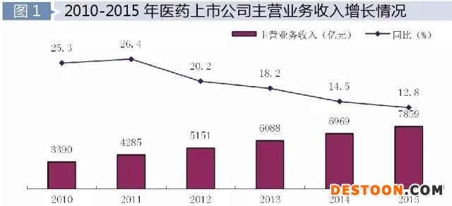 2010-2015年,我國醫(yī)藥上市公司主營業(yè)務收入從3390億元增長到7859億元,年復合增長率(CAGR)達到18.3%,增長勢頭逐漸下降。“十二五”規(guī)劃以來,由于受宏觀經(jīng)濟增速放緩、藥品降價、醫(yī)??刭M和醫(yī)藥出口增速繼續(xù)下降等因素影響,增速不斷回落。2015年年末,醫(yī)藥上市公司主營業(yè)務收入增長率為12.8%(見圖1)。