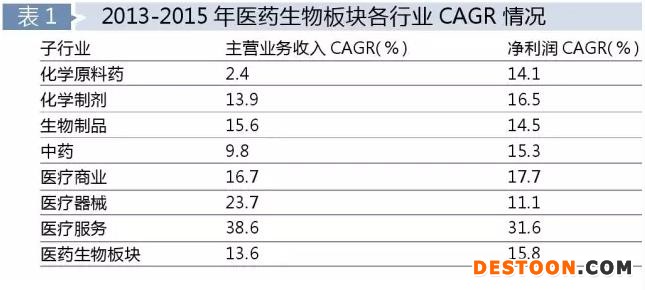 2013-2015年,在主營業(yè)務收入增長方面,醫(yī)療服務行業(yè)CAGR增長最快,達到38.6%;化學原料藥行業(yè)增長最慢,為2.4%。除化學原料藥以及中藥兩子行業(yè)外,其他行業(yè)CAGR均超過醫(yī)藥生物板塊平均水平。