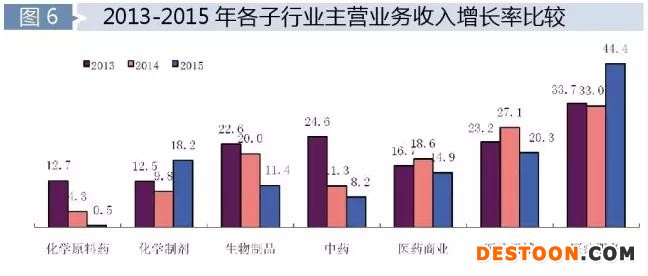 近3年各子行業(yè)主營業(yè)務收入增長率情況顯示,醫(yī)療服務增長率波動最大,2015年增長率更是大幅飆升至44.4%,整體呈上升趨勢?;瘜W原料藥則從2013年的12.7%降至2015年的0.5%?;幹苿┹^2015年有所回升(18.2%),而生物制品中藥增長率也出現(xiàn)不同程度的下降。