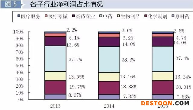 2013-2015年,子行業(yè)凈利潤占醫(yī)藥生物板塊比重最大的是中藥行業(yè),其次為化學制劑行業(yè),占比最小的是醫(yī)療服務行業(yè)。趨勢上看,醫(yī)藥商業(yè)、醫(yī)療服務行業(yè)所占比重有增大的趨勢,而化學原料藥等行業(yè)所占比重有所減小。