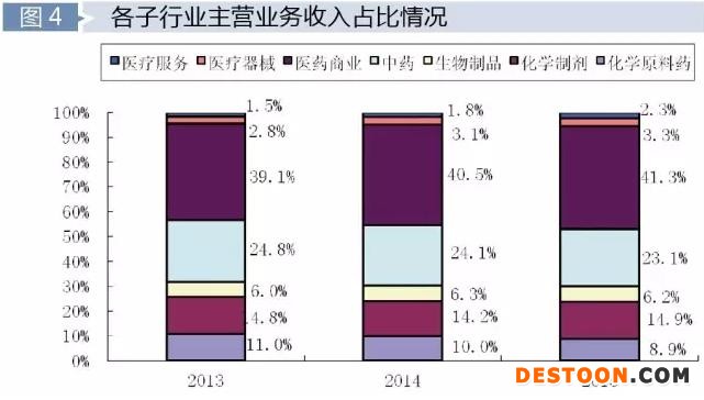 2013-2015年,子行業(yè)主營業(yè)務收入占醫(yī)藥生物板塊比重最大的是醫(yī)藥商業(yè),2015年達到41.3%,其次是中藥行業(yè)占23.1%,占比最小的是醫(yī)療服務行業(yè),僅占2.3%。從趨勢來看,近三年,醫(yī)藥商業(yè)、醫(yī)療器械以及醫(yī)療服務比例均有所上升,化學原料藥、中藥占比呈下降趨勢。