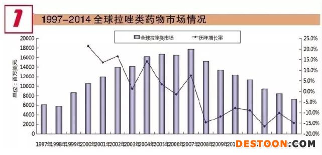 蘭索拉唑是由日本武田公司開發(fā)的第二代質子泵抑制劑。該藥1997-2005年市場上升較快,但2006-2014年則快速下降。2003年,其銷售額超過奧美拉唑,達到46.6億美元,在全球拉唑類藥物中排名第一位,2007開始市場快速下降。
