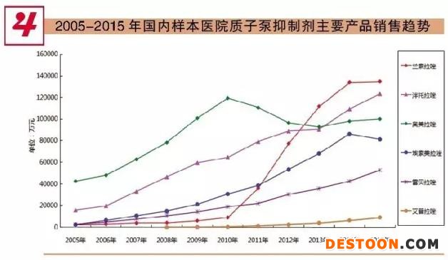 國內(nèi)PPI市場上主要產(chǎn)品有:蘭索拉唑、泮托拉唑、奧美拉唑、埃索美拉唑、雷貝拉唑、艾普拉唑。2005年國內(nèi)樣本醫(yī)院市場PPI銷售額為6.6億元,2009年銷售額過20億元,2015年銷售額已高達50億元。在患者增多以及消化性潰瘍轉(zhuǎn)變成慢性疾病需長期服藥這兩種因素的推動下,質(zhì)子泵抑制劑以其良好的品質(zhì)和優(yōu)秀的療效贏得了市場認同,該類產(chǎn)品在抗酸類藥物醫(yī)院終端市場占據(jù)絕對優(yōu)勢,市場保持了較快的增長速度。