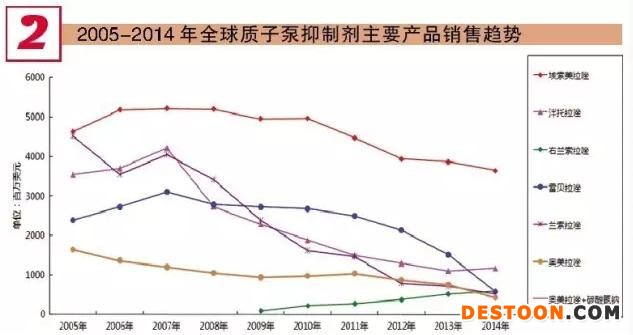 泮托拉唑是德國百克頓公司于1994年上市的質(zhì)子泵抑制劑,商品名為“潘妥洛克”,在美國由惠氏制藥以Protonix商品名上市銷售。2005年8月專利期滿,美國專利保護延長至2010年。2000-2007年,泮托拉唑市場上升較快,但2008-2014年呈下降態(tài)勢。2007年銷售額達到42.2億美元,2014年則快速下跌至11.8億美元。