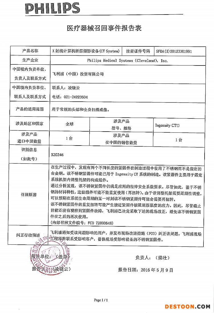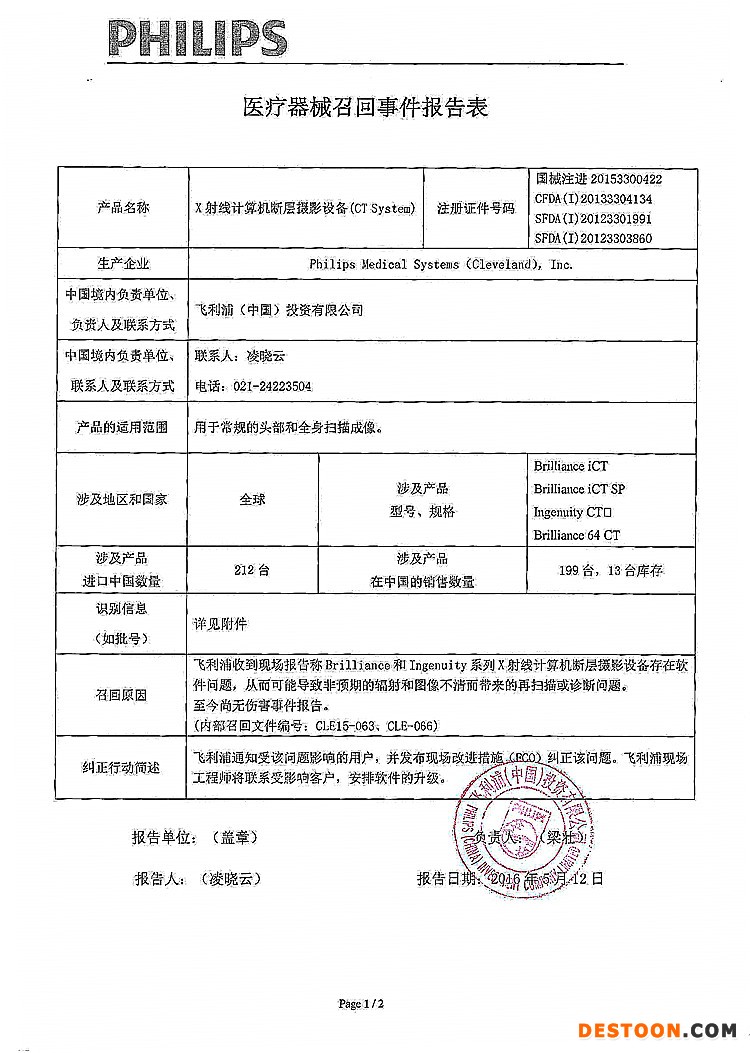11、飛利浦(中國)投資有限公司對X射線計算機斷層攝影設(shè)備(CT System)主動召回