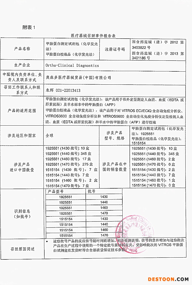 奧森多醫(yī)療器械貿(mào)易(中國)有限公司報告:企業(yè)發(fā)現(xiàn),涉及批號產(chǎn)品的反應(yīng)信號隨時間而增加。甲胎蛋白虛假升高具有中期或長期風險,可能導致治療錯誤。初步檢測表明,信號意外增加與這些批次產(chǎn)品在生產(chǎn)過程中使用的一個特定批號原材料有關(guān)。公司決定召回相關(guān)產(chǎn)品,本次召回級別II級,涉及產(chǎn)品的型號、規(guī)格及批次等詳細信息見《醫(yī)療器械召回事件報告表》。