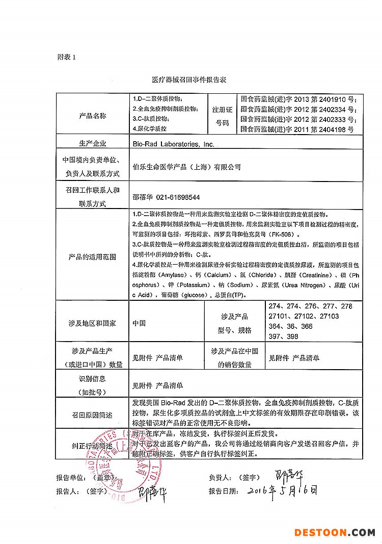12、伯樂生命醫(yī)學產(chǎn)品(上海)有限公司對D-二聚體質(zhì)控物、全血免疫抑制劑質(zhì)控物、C-肽質(zhì)控物、尿化學質(zhì)控主動召回