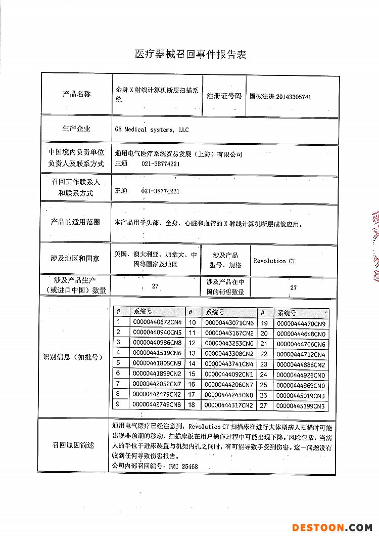 通用電氣醫(yī)療系統(tǒng)貿(mào)易發(fā)展(上海)有限公司報告:企業(yè)發(fā)現(xiàn),Revolution CT掃描床在進行大體型病人掃描時可能出現(xiàn)非預(yù)期的移動,掃描床板在用戶操作過程中可能出現(xiàn)下降,有可能導致傷害。公司決定召回相關(guān)產(chǎn)品,本次召回級別II級,涉及產(chǎn)品的型號、規(guī)格及批次等詳細信息見《醫(yī)療器械召回事件報告表》。