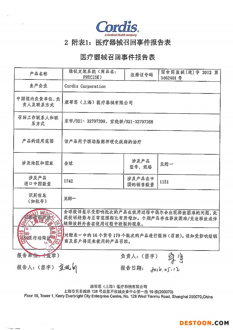 8、康蒂思(上海)醫(yī)療器械有限公司對鎳鈦支架系統(tǒng)主動召回