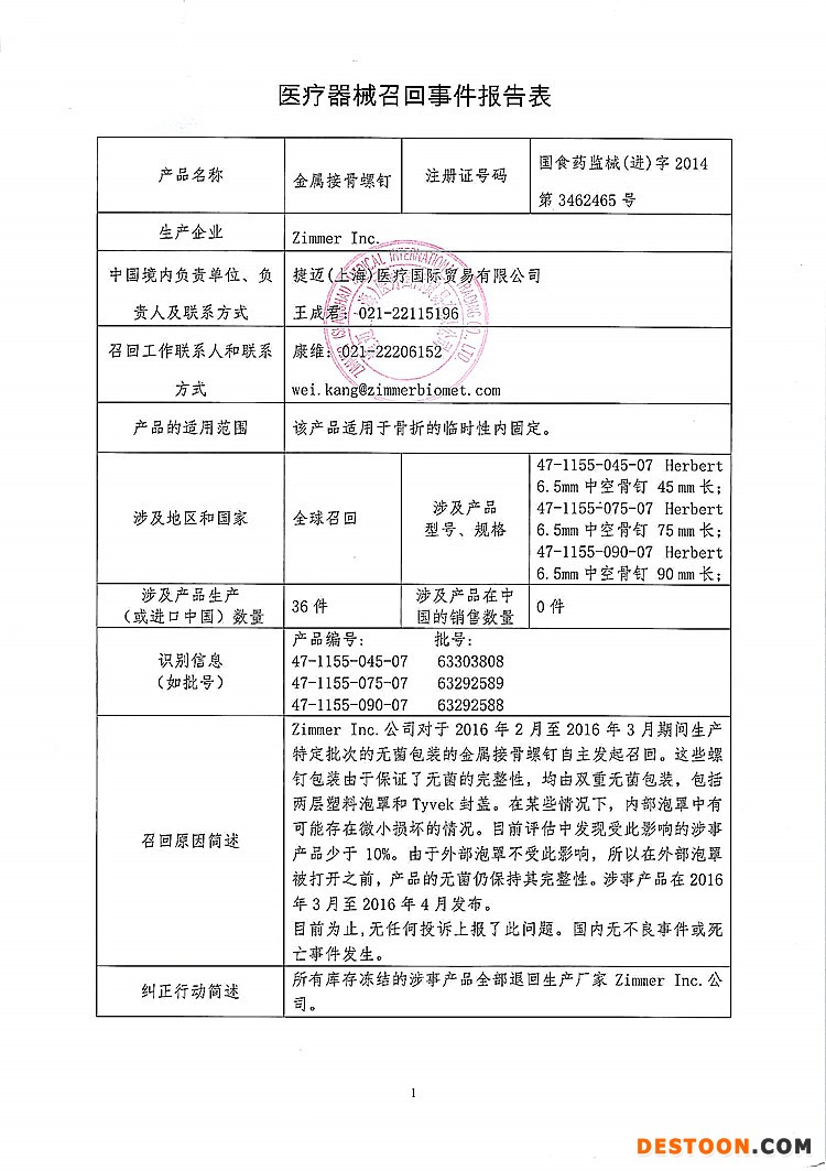 9、捷邁(上海)醫(yī)療國際貿(mào)易有限公司對金屬接骨螺釘主動召回
