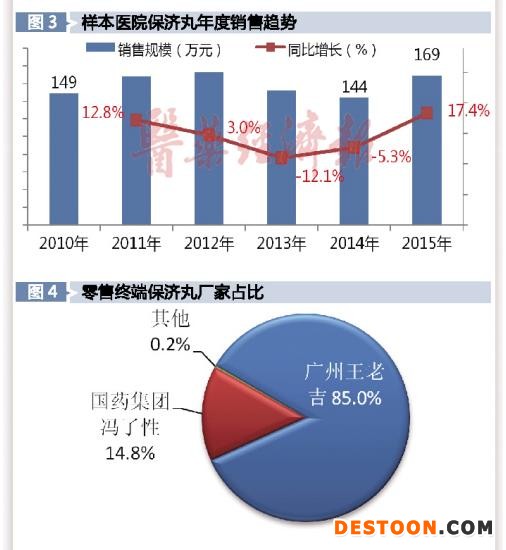保濟系列包括保濟丸和保濟口服液,該產(chǎn)品屬于經(jīng)典方劑,在民間曾有“北有六神丸、南有保濟丸”的說法,其主要銷售陣地在零售市場,在醫(yī)院中成藥市場,楓蓼腸胃康系列占了腸道用藥近四成市場,而厚樸排氣合劑隨后,也有18.22%的比重,保濟丸占了腸道用藥中成藥的0.7%。而在零售市場,保濟丸占助消化類2.6%的比重。與藿香系列產(chǎn)品有所不同,主要側(cè)重在傷食(如吃太多、吃太雜、太油膩、不干凈等)引起的腸胃不適、拉肚子,以促進消化、化滯消食等功效。2010-2015年零售終端年復(fù)合增長率為2.3%。從歷年的年度走勢來看,2013年有所滑落外,隨之緩慢上揚,2015年表現(xiàn)出色,是近5年內(nèi)同比增幅最大,達17.4%。該產(chǎn)品價格相對親民,競爭廠家不多,廣州王老吉藥業(yè)的兩個劑型壟斷近八成市場,國藥集團馮了性藥業(yè)也瓜分了14.8%的市場,其他廠家如廣東華天寶、廣東羅浮山白鶴制藥等份額較少(見圖3、圖4)。