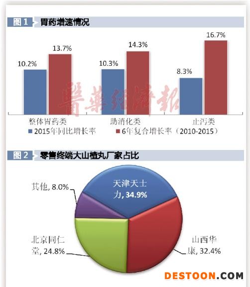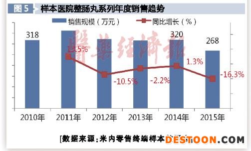 腸炎寧系列有丸劑、口服液、片劑、顆粒劑、膠囊劑等多種劑型,其中天施康的腸炎寧片通過近年有效的廣告推廣、終端店員推薦等手段迅速拉升銷售,成為該品種中銷售最好的劑型。而海南葫蘆娃制藥的腸炎寧膠囊2015年增速較快,也表現(xiàn)較好。丁桂兒臍貼屬于精準(zhǔn)細化市場,針對父母怕孩子吃藥副作用大的心理,也闖出了一片較好市場前景,2010-2015年的年復(fù)合增長率高達23.4%。