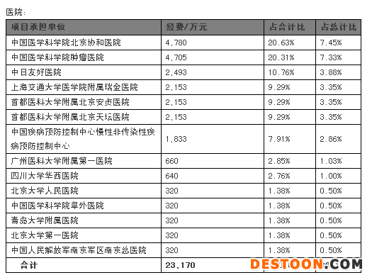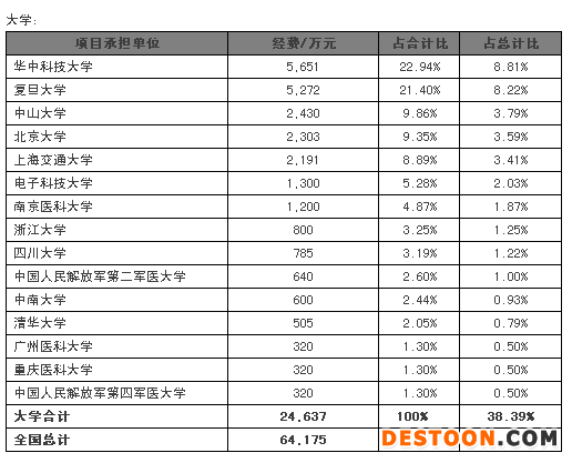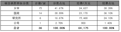 2、 項(xiàng)目承擔(dān)單位分類占比情況如下所示:大學(xué)15家,經(jīng)費(fèi)占比38.39%;醫(yī)院14家經(jīng)費(fèi)占比36.10%,均按降序排列;
