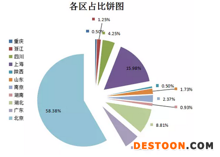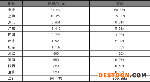 11個(gè)省中,北京經(jīng)費(fèi)總額37,464萬元,占比58.38%;上海經(jīng)費(fèi)總額10,256萬元,占比15.98%;各省份金額及占比如下表格所示: