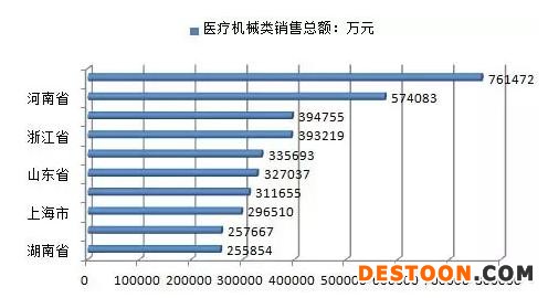 2015年全國醫(yī)療器械類銷售額排名前10的省區(qū)是:廣東、河南、北京、浙江、安徽、山東、四川、上海、黑龍江、湖南。排名前10省區(qū)銷售額占全國銷售總額的比例分布為:13.39%、10.10%、6.94%、6.92%、5.90%、5.75%、5.48%、5.21%、4.53%、4.50%。