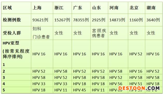 2011~2014年,中國的KingMed Diagnostics(金域檢驗中心)曾測試了51,345名女性宮頸樣品,發(fā)現(xiàn)高危HPV基因型,按降序排列,三種最常見的高危HPV亞型分別是HPV-52、16和58。HPV-18 僅排第六。