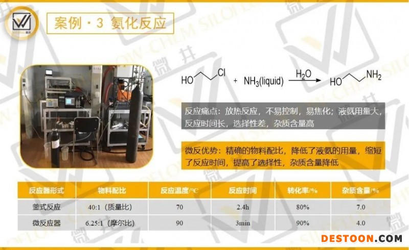 微通道反應(yīng)器的常規(guī)定義是利用精密加工技術(shù)制造的特征尺寸在10-1000μm之間的反應(yīng)器,擁有傳質(zhì)效率高,傳熱效率好,自動(dòng)控制精準(zhǔn),反應(yīng)體積小,放大效應(yīng)小等優(yōu)勢(shì)。微通道反應(yīng)器重點(diǎn)關(guān)注通道設(shè)計(jì)和選擇,并且依據(jù)加工工藝進(jìn)行優(yōu)化設(shè)計(jì)。目前主要含有實(shí)驗(yàn)室、中試撬裝、工業(yè)化撬裝三個(gè)級(jí)別;316L、HC-276、SiC、PTFE常規(guī)材質(zhì),鋯材、蒙乃爾等特需材質(zhì)為依托的產(chǎn)品體系。下面通過一些案例來介紹微通道反應(yīng)器的優(yōu)勢(shì)。
